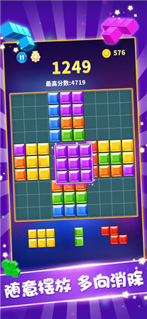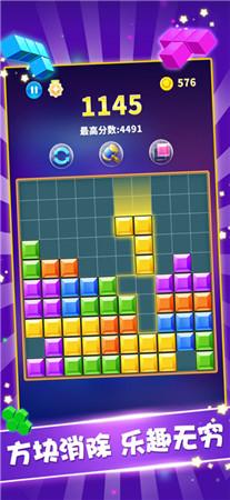 4、拖动玩法:把屏幕下方的三个备选方块拖到宫格内,当一行或者一列被铺满时就能实现消除。若出现备选方块无法放置的情况,那么消除游戏就宣告结束。