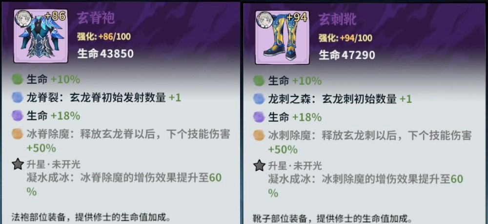 可以根据你所玩的角色,把那些带有强力技能词条的装备提升一下品质。重点是进阶到紫色,毕竟紫色词条提供的属性至关重要。我冰修的紫色衣服和鞋子其实是用融灵砂进阶来的,既不是抽卡得到的,也不是打怪掉落的。