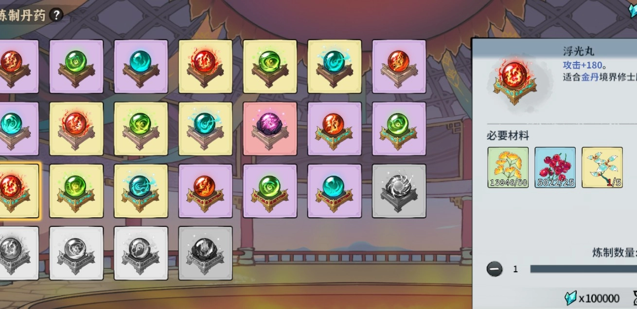 优先炼制加攻击属性的丹药,须弥尘不用节省,直接用来加速炼制!一般情况下大家只会重点培养一个角色,所以要提前计算好每种丹药需要炼制的数量,避免炼制过多造成浪费,否则后续可能会出现资源不足的情况(要知道一枚橙色品质的丹药就需要消耗10万灵石呢)。