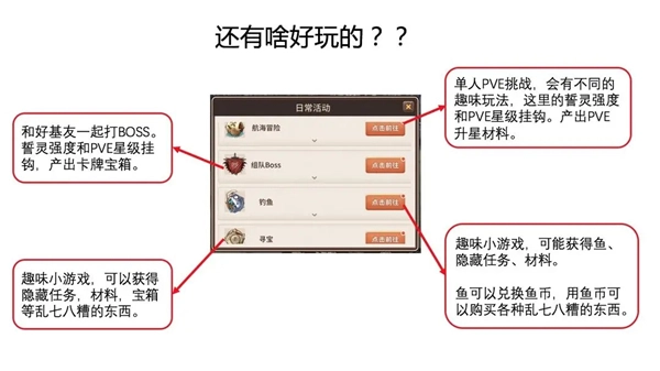 这里不止一种玩法,除了主要的探险玩法外,还有多种特色玩法等你体验!竞技场、水族馆、战兽、采矿、探索寻宝全都有!只有你想不到,没有这里玩不到。