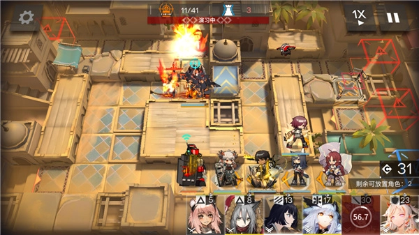 4、进入关卡后,开局先用两位先锋部署,这是比较经典的开局方式。此时地图上会出现三个战术防御者组长,它们正虎视眈眈地盯着我方。所以在先锋部署完毕、费用积攒到足够程度时,要优先把这三个防御者组长解决掉。要是队伍里有艾雅法拉的话,直接让她在高台上开启火山技能,就能一次性把这三个敌人都消灭掉。