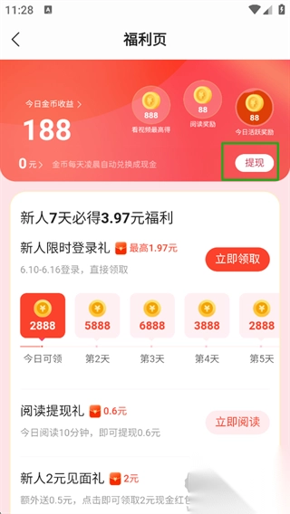 4、这边会有快速获得金币的方法,等余额到了一定程度就可以去体现啦(金币每天凌晨自动兑换成现金)