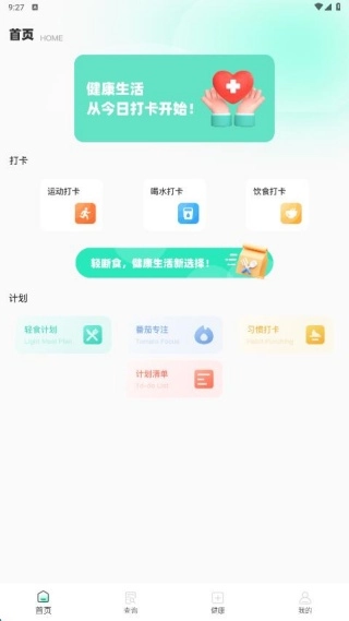 1、首页带来了打卡服务,可以轻松实现运动、喝水、饮食打卡管理。