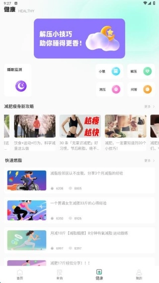 3、健康页面提供减肥信息以供参考,在这里你能知晓运动达人是怎样实现瘦身并控制体重的。此外,页面还设有睡眠监测服务。