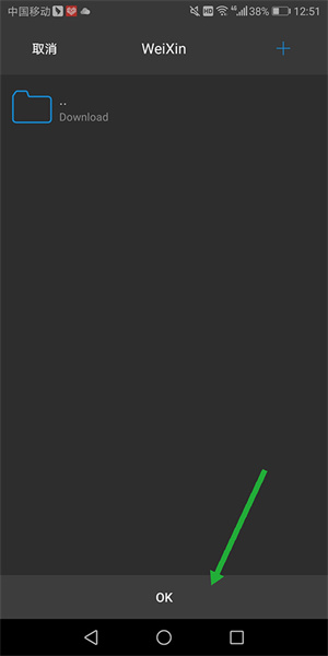 5、在弹出的页面中选择下载到手机上的具体文件目录下,也可点击右上角的【+】进行新建文件夹目录