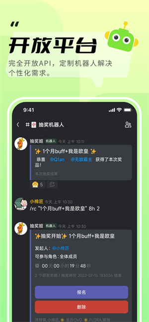 KOOK为有开发能力的用户提供了丰富的官方API,让用户可以在KOOK平台创造出很多有趣的机器人(Bot),来实现新手引导、日常打卡以及天气预报提醒、主题投票、群组代管等非常多样化的客制化功能。