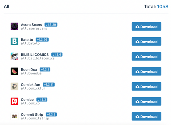 别慌,当你点开【浏览】中的“拓展插件”,便会发觉其中暗藏奥秘。Tachiyomi自带超1000个漫画插件,每个插件都关联着相应的漫画源,真可谓丰富多彩。