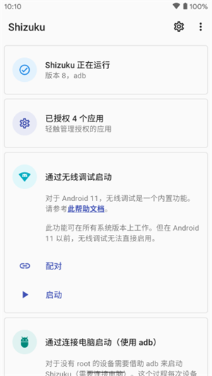 4.会显示配对成功,返回Shizuku选无线调试中的启动,成功后主页会显示Shizuku正在运行