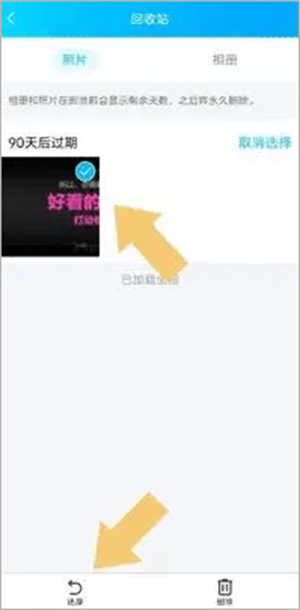 4、进入相册回收站页面,找到已删除的照片并进行还原。需留意,在回收站中再次删除的照片,将会被永久删除,无法找回。