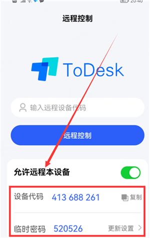 然后返回到todesk的首页,这时会显示“设备代码和临时密码”(如下图),这个在我们远程控制时会用到。
