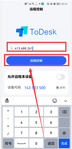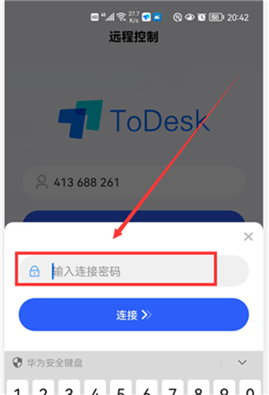 在输入框内键入“远程设备代码”,此代码即另一部手机的代码。接着点击“远程控制”按钮,随即会弹出一个弹窗,此时需输入“连接密码”,该密码就是另一部手机todesk首页所显示的“临时密码” 。