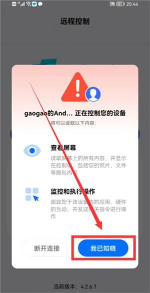 输入好密码后,点击“连接”,这时,另一部手机上会弹出“XXX正在控制你的设备”的界面(如下图)。