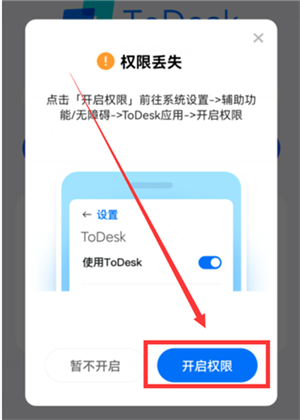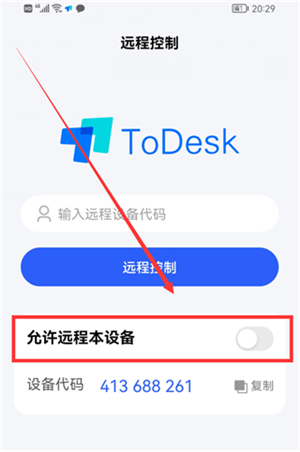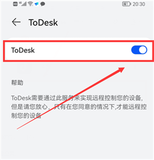 找到ToDesk选项,点击其右侧的开关,将开关打开,此时开关会变为蓝色(具体状态可参考下图)。至此,另一部手机便设置完成。