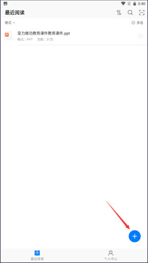 1. 轻点稻壳阅读器手机版首页右下角的“+”号按键。