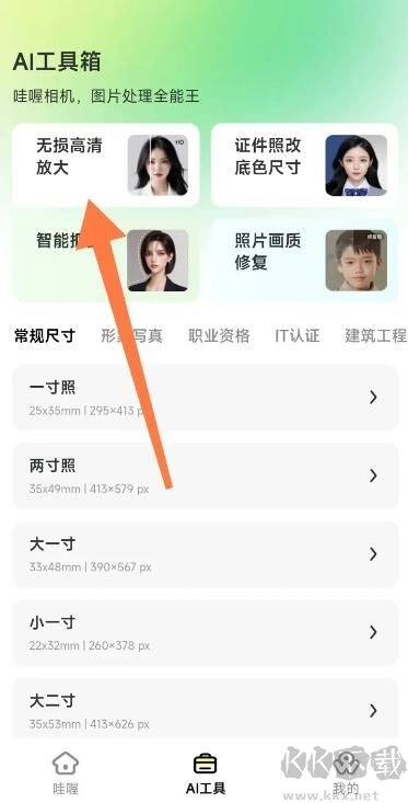 "提供一寸照、二寸照、护照照等多种规格证件照生成,支持背景抠图和AI增强,质量达到打印标准"u200c