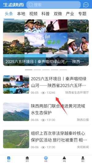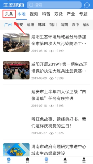 1、登录生态陕西后,在首页显著位置点击"今日头条"栏目,这里汇聚了最新热点新闻。