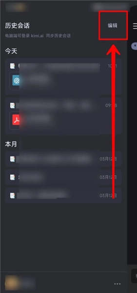 2、进入历史会话页面后,点击右上角的【编辑】。