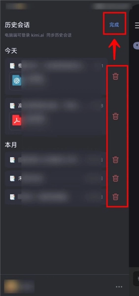 3、接着找到需要删除的历史会话,点击其右侧的【删除】图标,之后点击【完成】按钮就可以了。