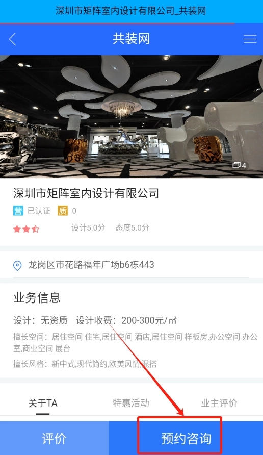 3、要是对这位设计师感到满意,直接点击页面右下角的“立即预约咨询”按钮,就可以开启和设计师的沟通了。