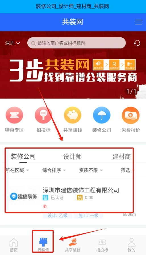 1、打开共装网 ,进入页面后找到 “找装修” 板块,这里既有装修公司,也有设计师选项,点击 “设计师”。