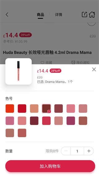 6、对于有色号等选项的产品,点击单品进入详情页,选择喜欢的颜色和需要的数量后,加入购物车