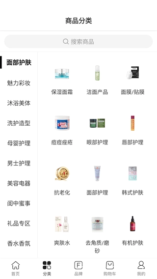4、在分类页面能够浏览到各类商品,涵盖面部护肤、魅力彩妆等品类。