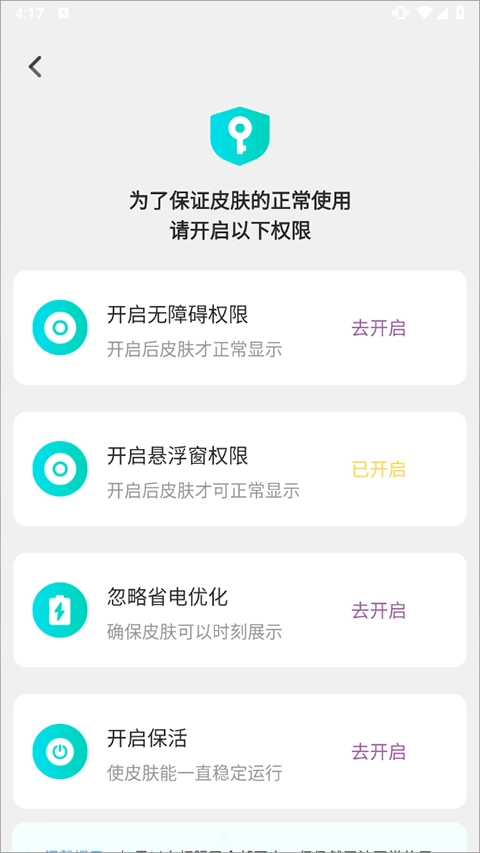 5、把所有权限都开启后,再次点击“设为皮肤”按钮,接着打开微信检查一下是否设置成功即可。