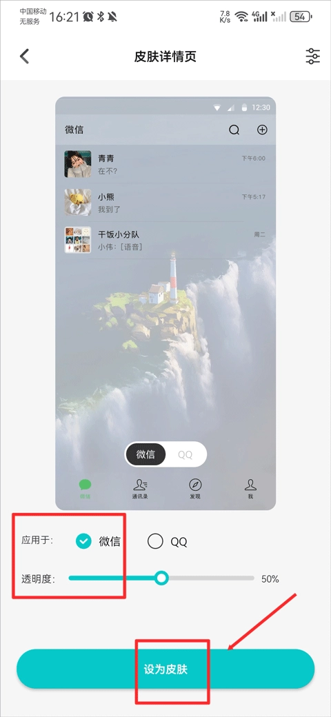 3、在皮肤详情页面里,勾选“应用于微信”的选项,并且调整好透明度后,点击“设为皮肤”按钮。