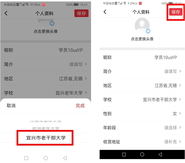6.在地区选项中选择江苏省无锡,在学校选项中选择宜兴市老干部大学