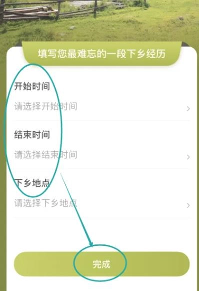3.进入下乡经历,输入时间和地点,点击完成